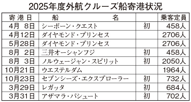県イン・アウトバウンド推進課によると、4〜10月に寄港した7回=表参照=のうち4回は初寄港で、乗客定員は千人未満が中心。ラグジュアリー(高級)客船も含まれていた。ほかの3回はダイヤモンド・プリンセス2回とウエステルダムで、乗客定員は約2千人以上の大型客船。各船ともおおよそ満席だった。