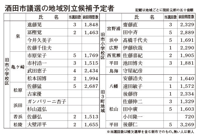 立候補予定者を旧市町別に見ると=表参照=、大票田の旧酒田市地域(有権者数は9月1日現在6万9381人)では、現職14人と前職1人、新人6人の計21人が、立候補に向け準備を進めている。